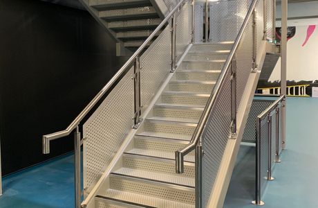 Fully welded and powder coated mild steel staircase with punch plate treads. Stainless steel handrail and uprights with punched aluminium infill panels.